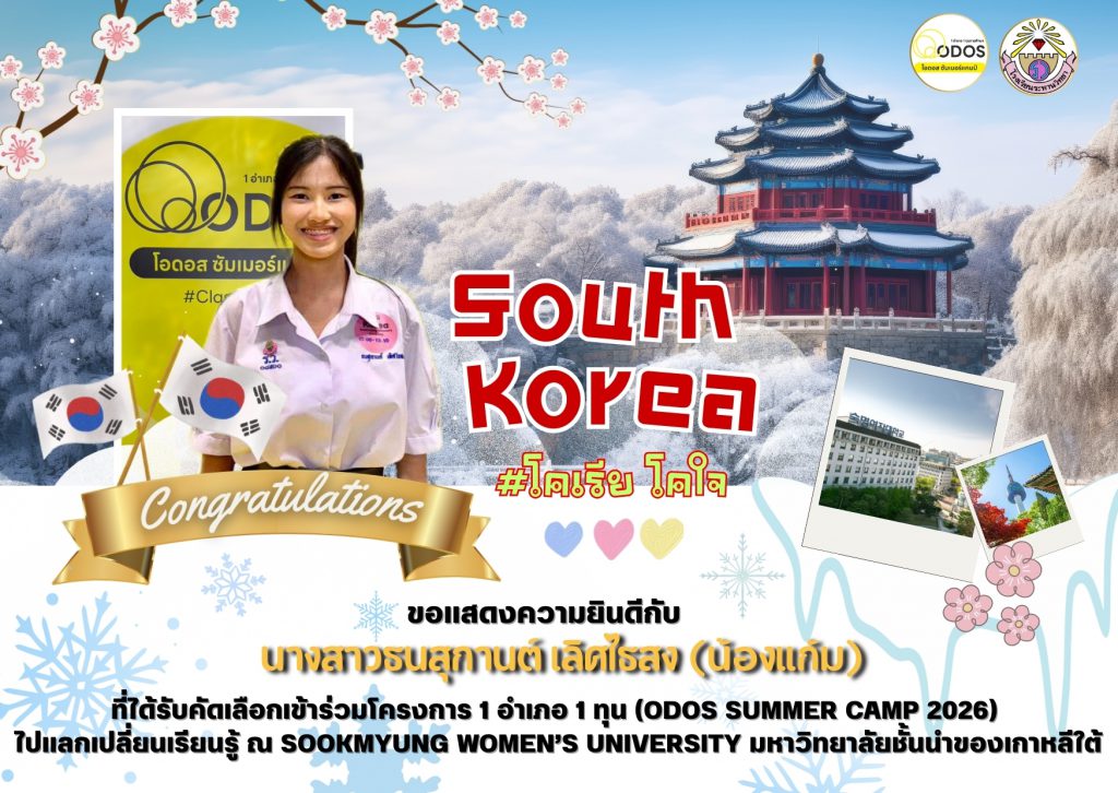 ที่ ได้รับคัดเลือกเข้าร่วมโครงการ 1 อำเภอ 1 ทุน(ODOS Summer Camp 2026) ไปแลกเปลี่ยนเรียนรู้ ณ Sookmyung women’s University มหาวิทยาลัยชั้นนำของเกาหลีใต้